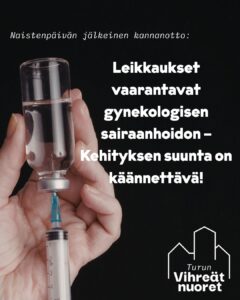 Loppujen lopuksi onkin selvää, että resursseja kaivataan erittäin kipeästi enemmän, ei vähemmän, gynekologiseen sairaanhoitoon, myös Varhan alueella. Jo valmiiksi alirahoitetun sekä alitutkitun hoitoalan voimavaroista leikkaaminen vaarantaa monen naisen ja sukupuolivähemmistöön kuuluvan terveyden sekä hyvinvoinnin. On korkea aika korjata yhteiskunnalliset epäoikeudenmukaisuudet myös terveydenhuollossa ja kääntää gynekologisen hoidon kehityksen suunta!